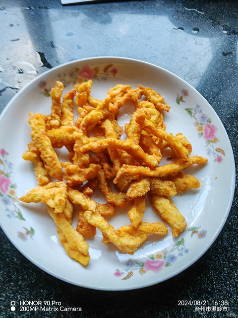 半块鸡胸肉切条,加盐,鸡精,老酒,胡椒粉腌一下,面粉,淀粉,泡打粉调个糊,把调好的糊倒入腌好的鸡胸肉丝里,搅匀,一条一条下锅炸,炸好了捞出来等油温上来了复炸一遍,可以吃了