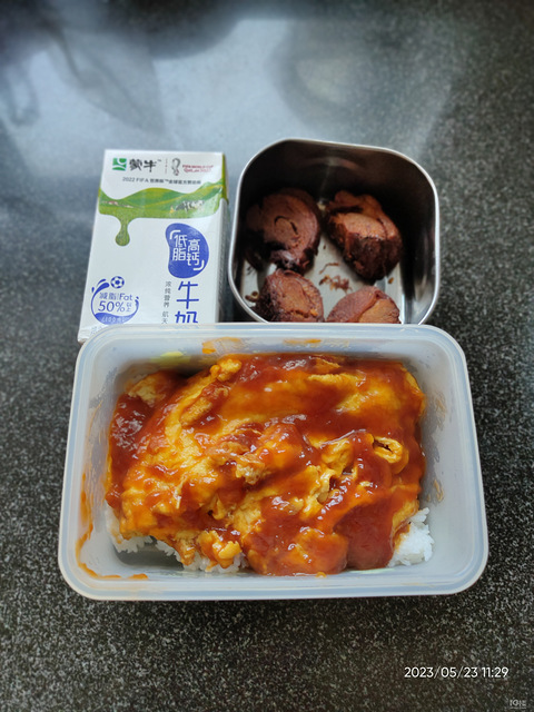 本来中午做寿司的,结果米饭煮软了,咋办,时间来不及了,做个茄汁炸蛋,再炸一点卤鸭,就是香喷喷的烤鸭了,配个牛奶,嗯,应该可以了。