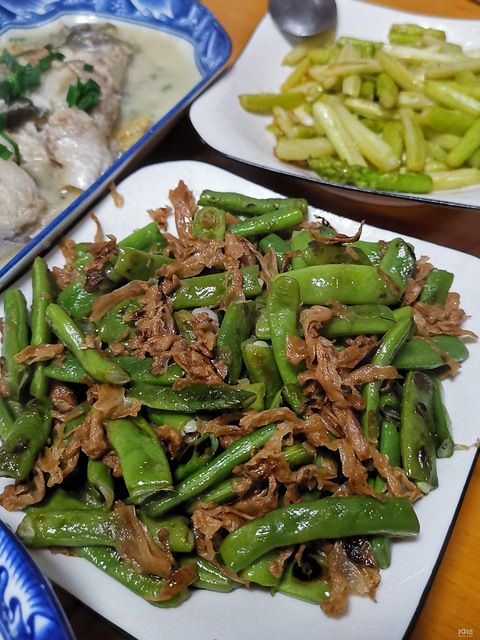 周末家里吃家烧鲈鱼,活鱼,肉质不错蒜蓉芦笋,豆角萝卜干丝瓜鸡蛋汤!!!三个人够吃!