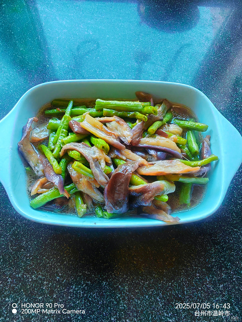 自家种的茄子,茶豆,就摘了这么点,分开炒太少了,合并一起炒试试,锅里油热茶豆茄子一起倒入,各种翻炒,加盐,一圈老酒,加点水煮熟,放鸡精,拌匀出锅