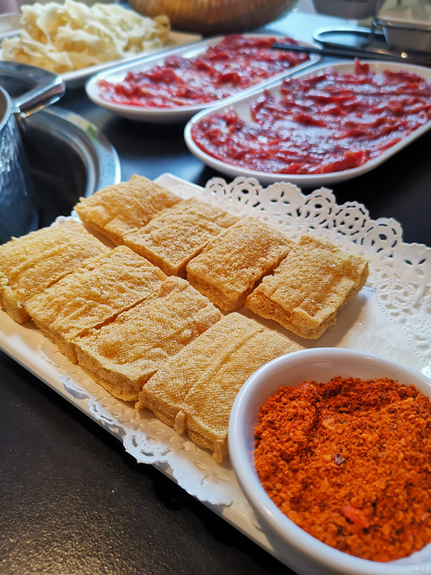 赭溪老街的牛肉火锅店,今天吃原味,也不错牛肉新鲜,爆浆豆腐好吃双人餐吃撑,把面吃完的话,三个人也够
