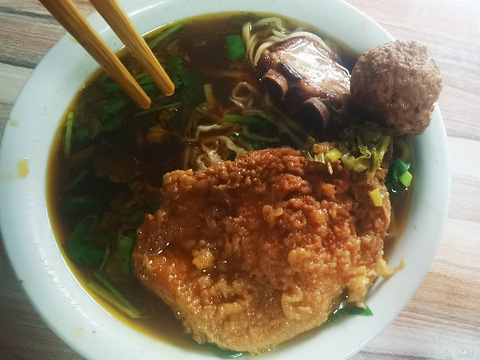 光明路冬飞面馆的汤面浇头点了,小排,大排,还有肉圆。面还是可以的老手打面。大排肉质偏柴,糊了一层粉虽然用红糖炸过,里面肉质不是新鲜的。本来炸马鲛鱼尾也是特色,我没点留到下一次体验。