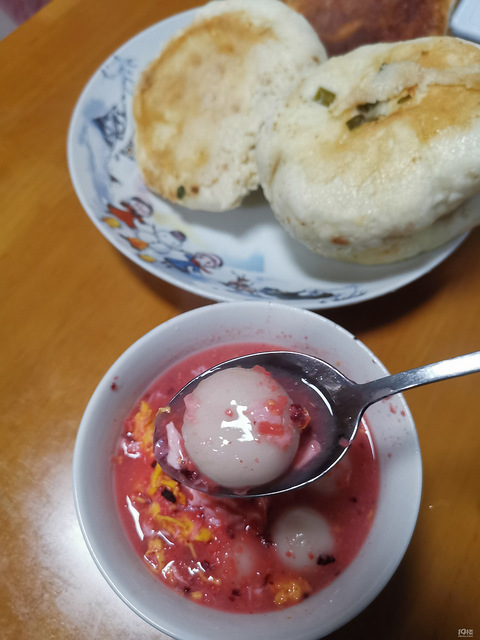 正月十五吃剩的汤圆邻居给的酒糟还是不错的,配一个外面买的豆腐包水煎的,好大一个,吃完很撑!