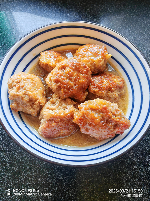 以前做肉圆,都不加淀粉,这次加了淀粉,口感软糯一些,吃着也是可以的,快餐店就这种口感。懒得剁肉,绞肉机解决了,加盐生抽耗油老酒淀粉搅拌均匀,锅里油热,一个一个下锅里煎两面金黄,一圈老酒,加水煮开中小火炖煮十分钟就可以了