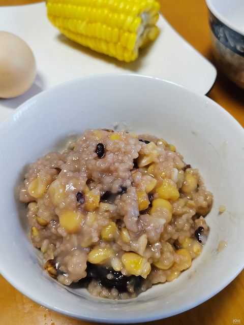 定时的杂粮玉米渣粥配榨菜,再来半个玉米一个鸡蛋,十一点不到饿了!
