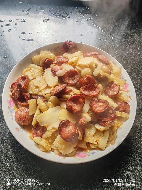 又去邻居地里挖了些洋姜,用麻辣香肠炒炒。洋姜用牙刷刷干净,切片,麻辣香肠切片,锅里倒油,放入香肠煎炒,再放入洋姜片,炒炒,加点盐,一圈老酒,翻炒变色放一点水,煮开加鸡精就可以了