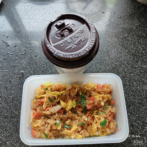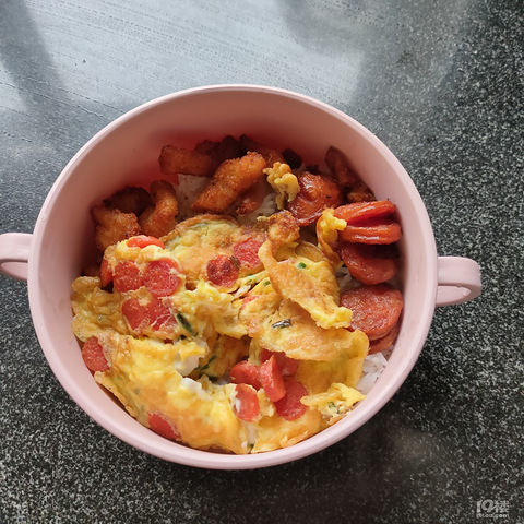前几天炸了糯米粉饼,今天晚饭炒炊饭,不吃肉只能用火腿肠代替,不吃包心菜,用了点大白菜,总体来说,炒的很香哦!奶茶咕咕,应该不会胖[ej=1F602]