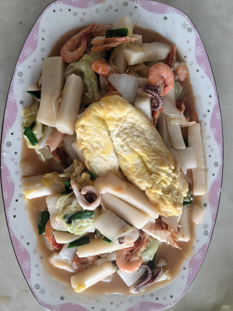 想吃炒糕,不要很干的那种要带一点汤,但不要汤很多的。虾,鱿鱼,五花肉丝,酱油肉,鸡蛋,一根年糕,黄叶菜芯,大蒜叶一根,这些成本差不多30元吧。虽然外面一碗糕18元够了,但我这料多一点点吧[/11害羞]