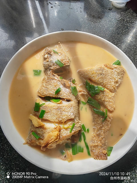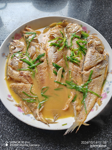 七块钱一斤,很鲜,买了两条,12块钱。鱼鳞刮干净,内脏取干净,留下鱼胶,热锅热油,不会破皮,加姜片大蒜,两面煎好,一圈老酒,挤些耗油,盐,热水等下去,炖煮六七分钟,大蒜叶子放下去咕咚一分钟出锅