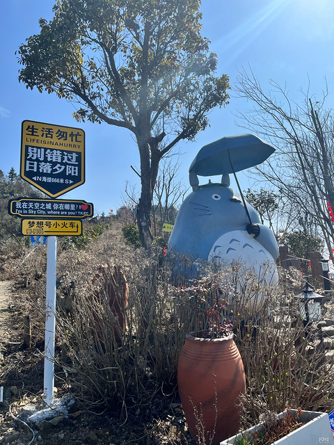 旅游地:黄岩天空之城游玩天数:1游玩费用:100游玩内容:很早的时候刷到天空之城就像来一直没来。这回实在没地方去就决定来一下。哈哈哈。后悔没早点来啊。这里就是现实版宫崎骏的天空之城。整个景区都是以宫崎骏动画主题为主。本来以为会没什么人,后来发现来逛的人陆陆续续也还不少,这里的空气贼拉新鲜。撑伞的龙猫好像在欢迎我们。上山的路山路十八弯,有点不好开,所以这回我们拉了个老司机给我们当驾驶员。不然就我们的