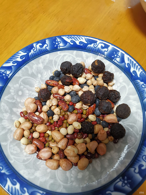 提前泡豆子,至少3小时放了点桂圆,电饭煲定时煮粥早饭吃腊八粥,配了鸭蛋羊肉,花卷,吃很饱!