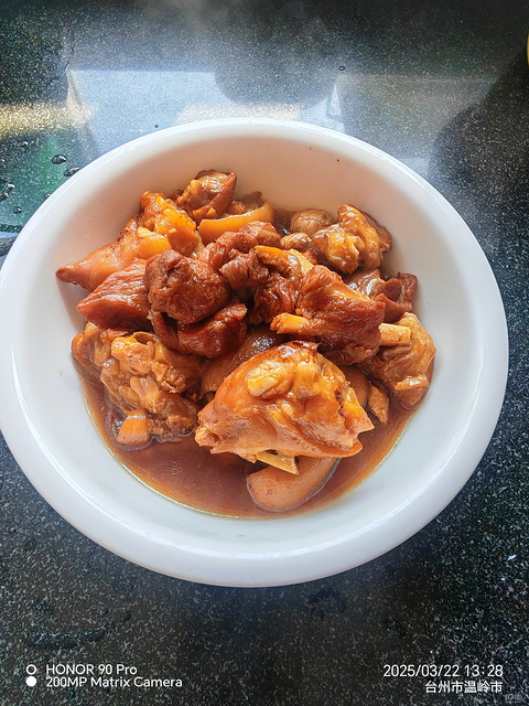 猪蹄洗干净,加老酒生姜焯水,再清洗干净,放电压力锅,加红糖,生姜,老酒,生抽,老抽,冰糖,加水,炖煮就好了,感觉不够软烂,再煮一遍,香喷喷的,不加油,也不会腻