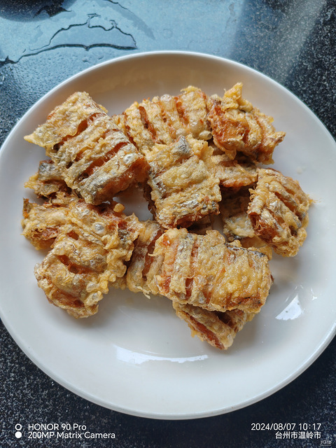 七块钱的带鱼,六条,四块钱一斤,很鲜,亮度很好,就是小点,不过太便宜了吧!回家洗洗切头切尾,剖肚去内脏,去黑膜洗干净,切成一段段,用盐,老酒,胡椒粉腌半小时,小酥肉粉加鸡蛋液拌匀,热锅热油,油温九层热,带鱼段裹一层小酥肉粉糊,放油锅炸,两面金黄酥脆捞出来,然后复炸一遍就可以了,好好吃呀,外酥里嫩,鲜香酥脆。