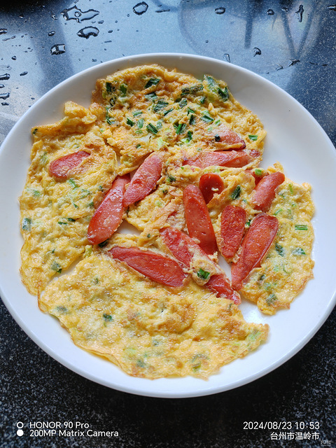 不晓得为什么,百吃不厌,就像方便面,天天吃都可以,火腿肠切片煎一下,倒入鸡蛋葱花液,一面金黄翻面,煎熟就好了,老香了
