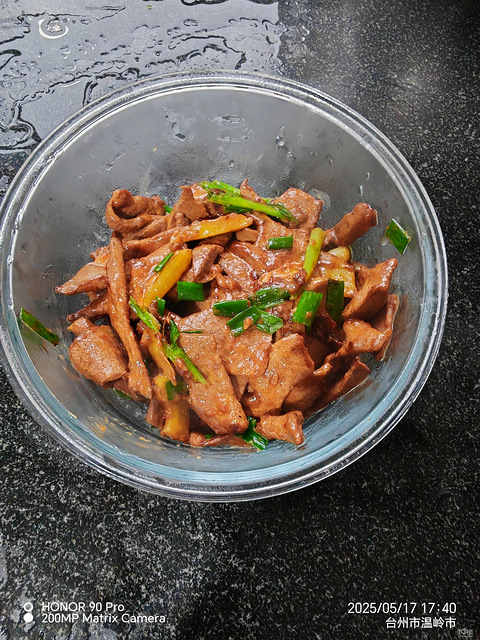 弟弟晚上和朋友聚餐,怕我猪肝炒不好,下午把猪肝席,切,腌好了,让我晚饭的时候滑炒一下就好了。热锅热油,放猪肝炒,马上放姜片,葱白,爆炒,一圈老酒,炒两下,葱花,关火出锅