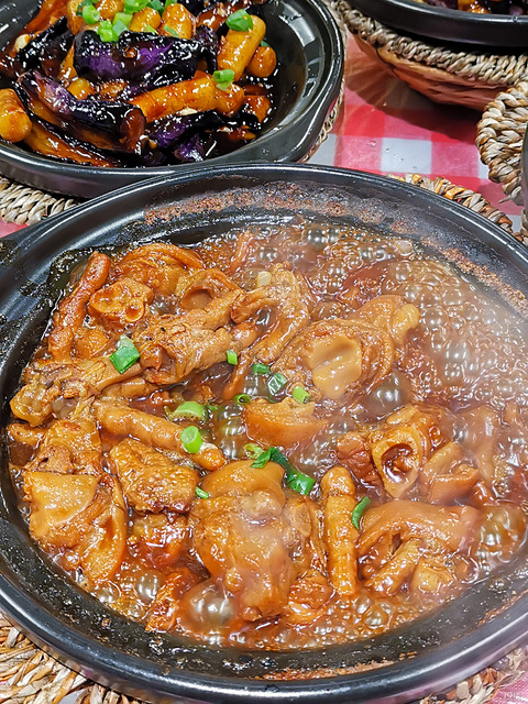 好吃好吃,每个菜都新鲜出炉,热气腾腾,猪蹄还在沸腾,鸡爪很脱骨,非常!茄子年糕,特别好吃,酱香味浓郁,甜甜的!最爱还是鱼头,不吃鱼皮的我,也爱这口,两个人吃一份刚好!