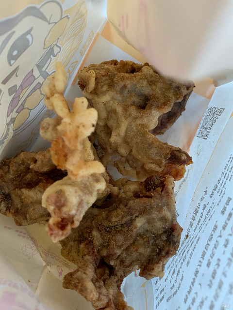 加班,外卖榆林炸鸡。是炸得金黄的鸡叉骨,其实就是带着点肉的鸡架子,但那股子孜然味儿直往鼻子里钻。抓一块啃,肉不多,炸得酥,骨头缝里都透着焦香,孜然撒得足,越嚼越有味。还有同事送的烤地瓜,跟咸香的鸡叉骨正好配。