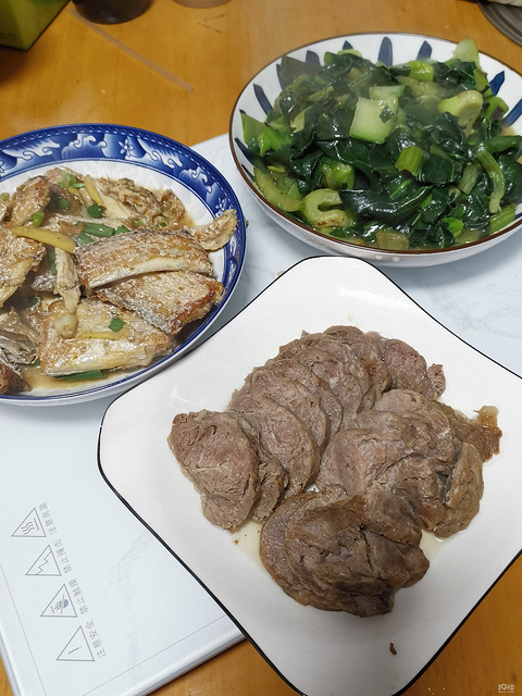 两荤一素,牛肉是之前卤好的米饭上面蒸一下,蘸不蘸酱油都可以吃烧个带鱼,大概两只,炒个青菜,光盘一下!