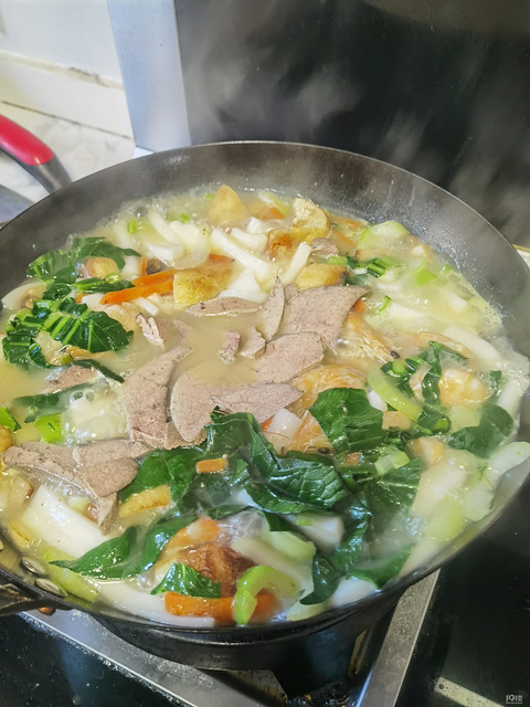 之前冷盘剩下的今天煮面了,放了青菜香菇,虾干……快煮好的时候放了菜叶后再加入切片猪肝煮两分钟,热透就行
