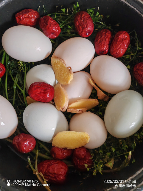 荠菜头天地里拔的,我洗了十个鸭蛋,洗破一个月就九个吧!荠菜洗干净放电饭煲,12个红枣洗干净,六片生姜,然后一小把冰糖,加水煮,煮开再煮十分钟,把蛋壳敲破,再煮半个小时就可以了,昨天上午还在银行除了吃了个