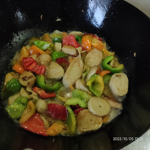 很喜欢吃面筋,买了一包,切片,买了两个漂亮的彩椒,洗洗,切块,面筋炒香了放彩椒,稍微撒点水,煮开就可以了
