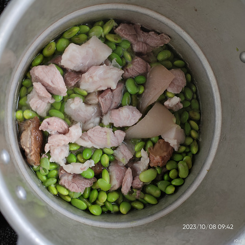 自家种的毛豆,剥了一些,烧猪肉曲,毛豆,猪肉,把猪皮也放下去了,老酒盐,就放高压锅煮,