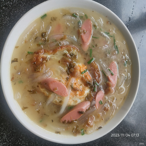 煎个荷包蛋,火腿肠煎一下下,放点外婆菜炒炒,加热水,加点盐,煮开放土豆粉,煮个两三分钟,撒葱花,放鸡精,吃早餐了