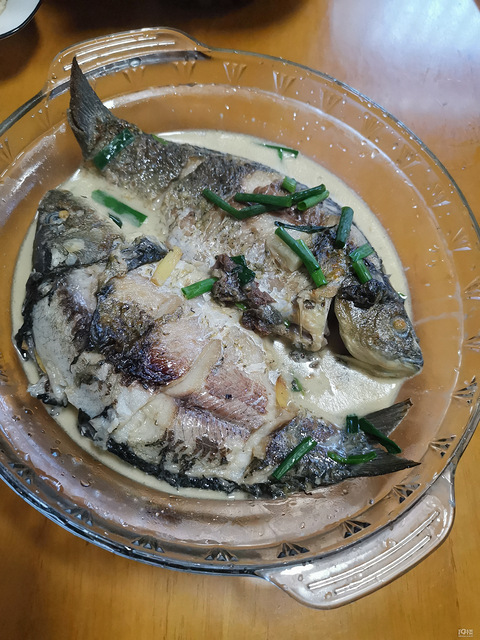 本来想红烧的放了点水,就奶白色了那就再放点水炖汤了还是不错的两面煎黄放入葱姜蒜大火猛煮加点盐,葱段!出锅!