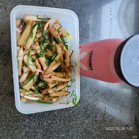 买了个鱿鱼,半斤年糕,加一把韭菜,两个大蒜瓣,一些姜丝,三小段小米辣,就这么多,配一杯自制饮料,加一个巧克力冰激凌,午餐有着落了