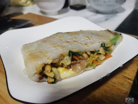 天台比较客气的小吃吧有的地方清明会吃!蔬菜,肉,蛋放中间!稍微煎一下!