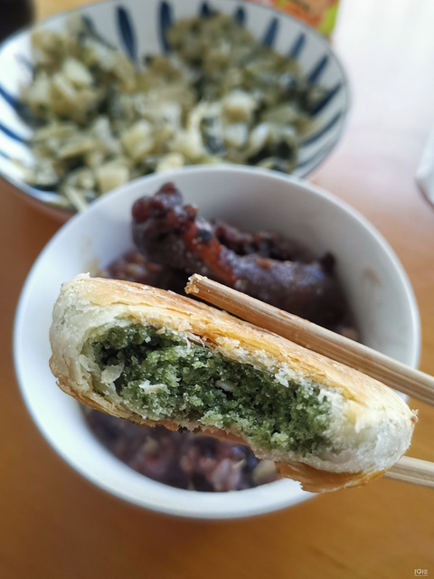 昨晚没在家吃,家里人留了锁骨早上配黑米粥吃了,再来个朋友带回来的海苔饼吃两口咸菜,今天早饭就这样吧!