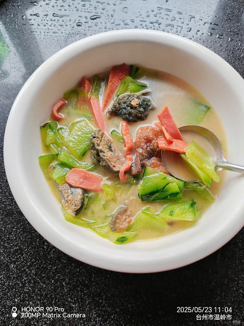 一个皮蛋切八瓣,黄瓜洗干净削皮,切段,切片,热锅倒油,放皮蛋煎一下,火腿肠切小条,煎一下,皮蛋煎两面虎皮放黄瓜,炒炒,然后加入热水,放盐,鸡精,一般煮两分钟就差不多了,我喜欢多煮一会,入口即化去的那种[/11害羞]