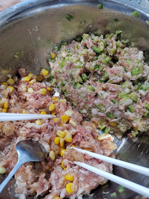 今天是玉米虾仁肉馅和青椒猪肉馅玉米的高压锅煮汤青椒的蒸起来吃放点蒜蓉酱,都好吃