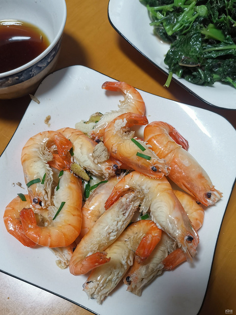 罗氏虾一些大蒜炒苋菜白斩鸡淋点酱汁吃饱喝足去散步