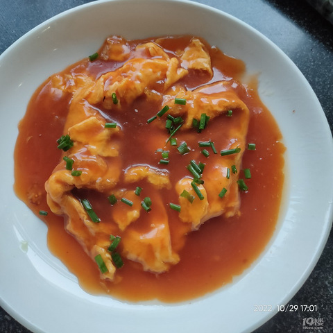 鸡蛋打散,锅里油多一些,多一些哦!油热倒入鸡蛋液,小火,蛋翻面,中火,捞出来,再调个酱汁,煮开了放入炸蛋,出锅了撒葱花,能吃三碗米饭哦!