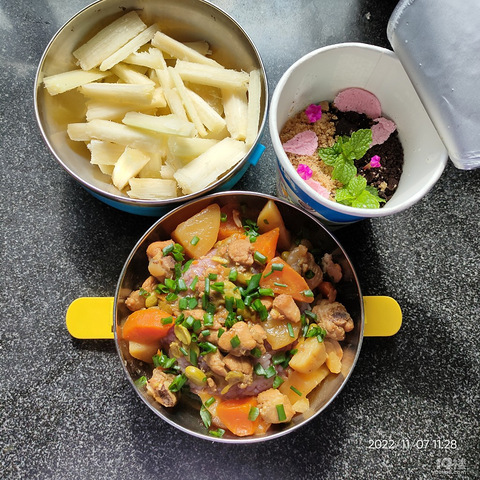 昨天的午餐,咖喱鸡肉土豆盖浇饭,用酸奶,奥利奥饼干,桃酥做了酸奶盆栽,立冬,配了甘蔗,还是蛮好看的,也是很好吃的!
