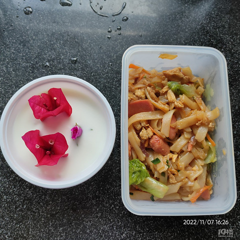 买了一斤河粉,用鸡蛋洋葱火腿肠烤肠生菜炒一炒,味道非常的棒,酸奶加了两朵三角梅花和一朵太阳花点缀,好看一些哈!