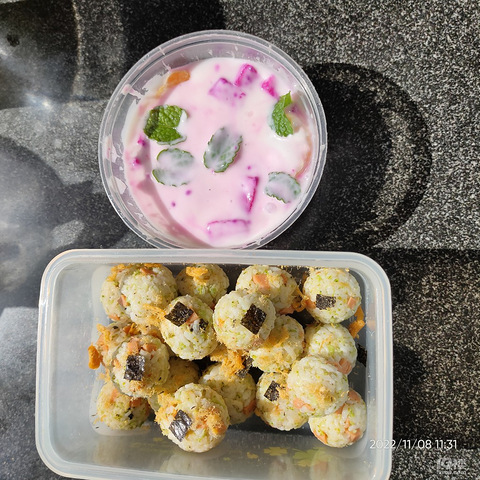今天的午餐,用西蓝花,海苔肉松,火腿肠,沙拉做了小饭团,酸奶加了火龙果和橘子,再加几片薄荷叶子点缀,,你想吃吗?