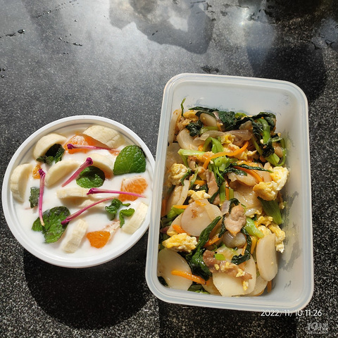 年糕用鸡蛋洋葱胡萝卜丝青菜炒炒,加点耗油生抽,颜色味道都有了,酸奶水果捞,家里就香蕉和橘子,颜色不够啊,拿点夜饭红的花和薄荷叶子来凑吧,看着也是可以的。