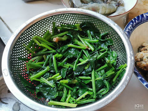 菠菜汤的菠菜得焯水捞起备用,吃剩的丸子放入沸水煮开再放入菠菜,一丢丢盐