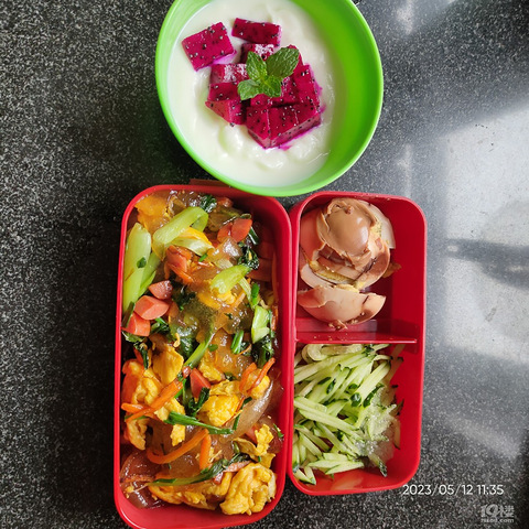 最近喜欢上吃东北大拉皮了,炒一份,配个自己煮的茶叶蛋,再来点爽口黄瓜丝,再来一碗酸奶火龙果,卖相不错,味道也不错!光盘了