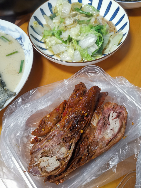 熟食店活动,鸭头五元一个买了三个,一人一个,超辣超过瘾,再弄个白菜,煮个鲫鱼吃完身体暖暖的!!!