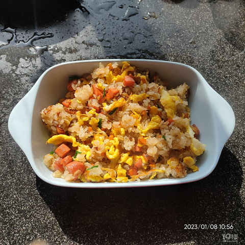 炒饭好像鸡蛋火腿肠葱花是标配,再加点虾皮胡萝卜丁,随便炒炒都是好v吃的,加点盐,没放生抽,