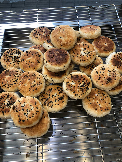 刚烤起来的绿豆饼真是香啊,2元一个,还有一种椒盐味的,一点点咸甜,味道真不错,小朋友老人都爱吃。吃完再来点西瓜。