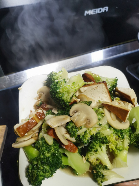 中午做年糕剩下的蘑菇,豆干一起炒个西兰花西兰花先焯水再弄一点蒜爆香放入蘑菇,豆干炒一炒再放入西兰花翻炒适量盐,酒一点水,大火煮不然会黄