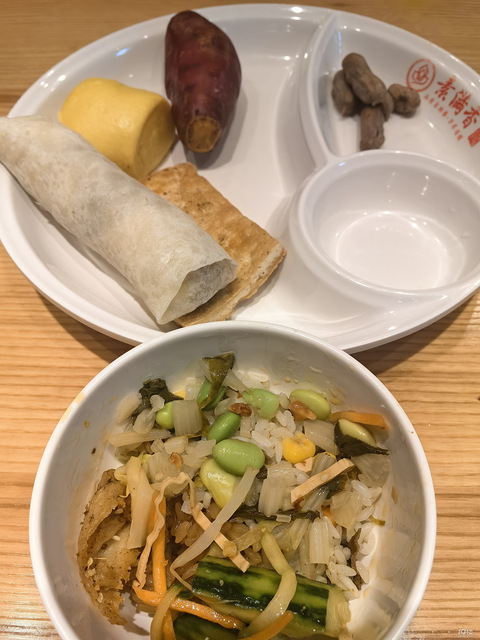 素食自助餐22元一位,好像吃的东西很多一样,又好像没什么好吃,弄了点糯米饭,凉皮,番薯,桃浆。 中午就吃了这些,没吃回来吧? 饺子吃了4个