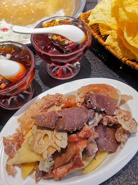 一个半斤牛杂拼盘,一份牛肉,一份千层肚,还有青菜,海带苗,蛋饺,鱼丸,炸腐皮,油条,两个冰粉,台州估计原价和杭州差不多,团购168吧两个人根本吃不完,牛肉很新鲜!