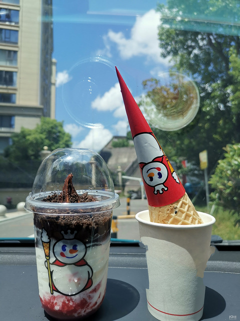 11-17号,美团都有的下班太晚就没吃今天去了,拿个杯子,装两个甜筒最近特别容易化再把大圣代用了之前美团免单抢的巧克力,奥利奥,草莓酱多种口味,给力还有沪上阿姨,也是美团给的但七分糖,像三分