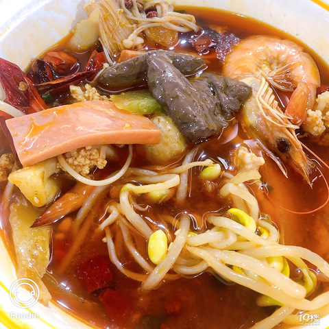 某心心的毛血旺,现煮的,28元,大概四片血,三片肉,一片毛肚,四只虾,豆芽,花菜,莴笋,分量一般般