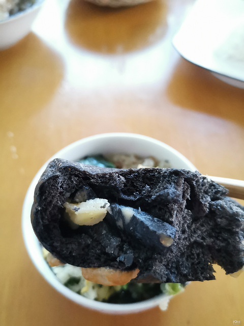 墨鱼肠贝果+炒饭新店开业,买了两只贝果黑色的是墨鱼肠,真的塞了墨鱼肠再来一碗青菜鸡蛋豆炒饭
